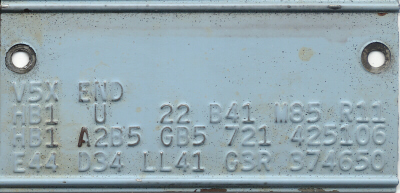 GB5 is the color of the upper door frame (above the door panels). GB5 is medium blue, G=1972 was the year this paint color was first offered, B=Blue, 5=Medium Hue. Cars that don't have upper door frame paint, e.g. the door panel goes all the way up to the door glass, will have '000' in this location.